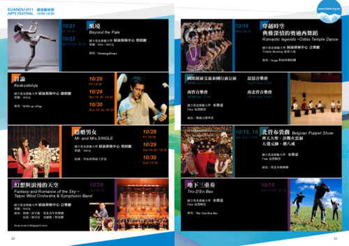 紙境、討論、隱婚男女、幻想與浪漫的天空、穿越時空 典雅深情的奧迪西舞蹈、國際展演交流泰國行前公演、南管音樂會、琵琶音樂會、南北管音樂會、北管布袋戲 Beiguan Puppet Show 齊天大聖.決戰火雲洞 天蓬元帥.豬八戒、地下三重奏